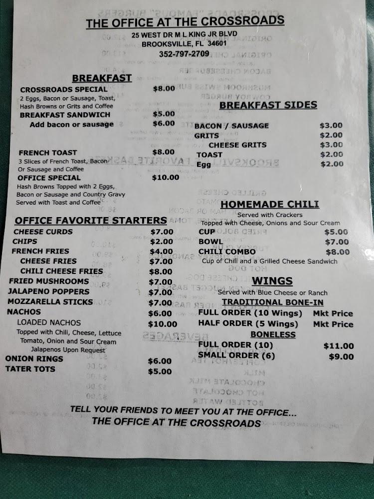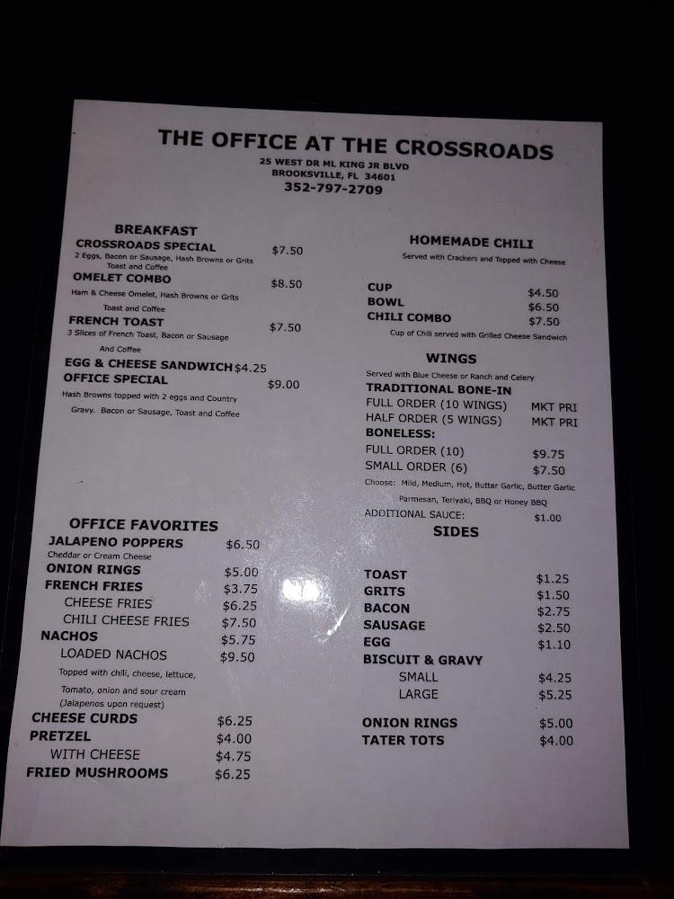 Welcome to The Office at the Crossroads, the oldest bar in Hernando County, where nostalgia meets great taste! Join us for the best burgers in town and enjoy our lively atmosphere filled with karaoke, live music, and sporting events. Whether you're stopping by for breakfast, lunch, or dinner, our diverse menu offers something for everyone, including delicious cocktails and a wide selection of beers. With convenient takeout and delivery services, as well as a welcoming patio, we cater to your dining preferences. Visit us at 25 W Dr Martin Luther King Jr Blvd in Brooksville, and experience a vibrant local hangout like no other!